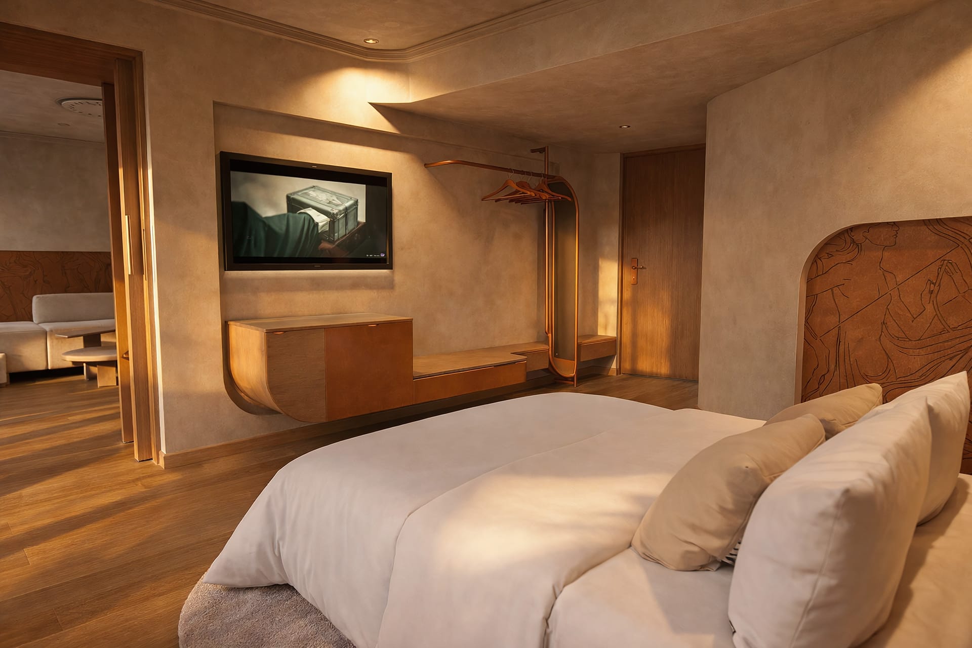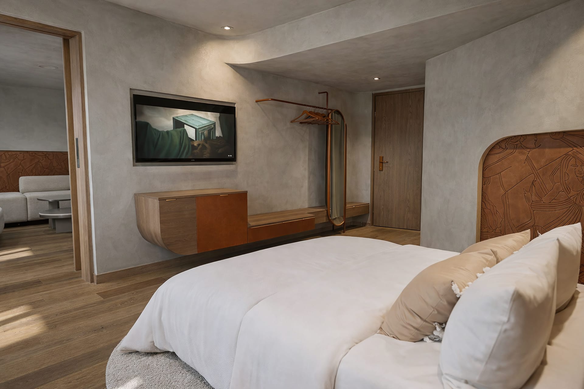 This room offers both, a (separate) bedroom and a separate living room, and (as well as) a balcony offering spectacular views.