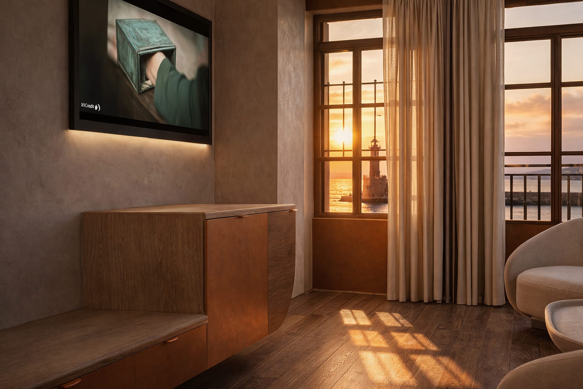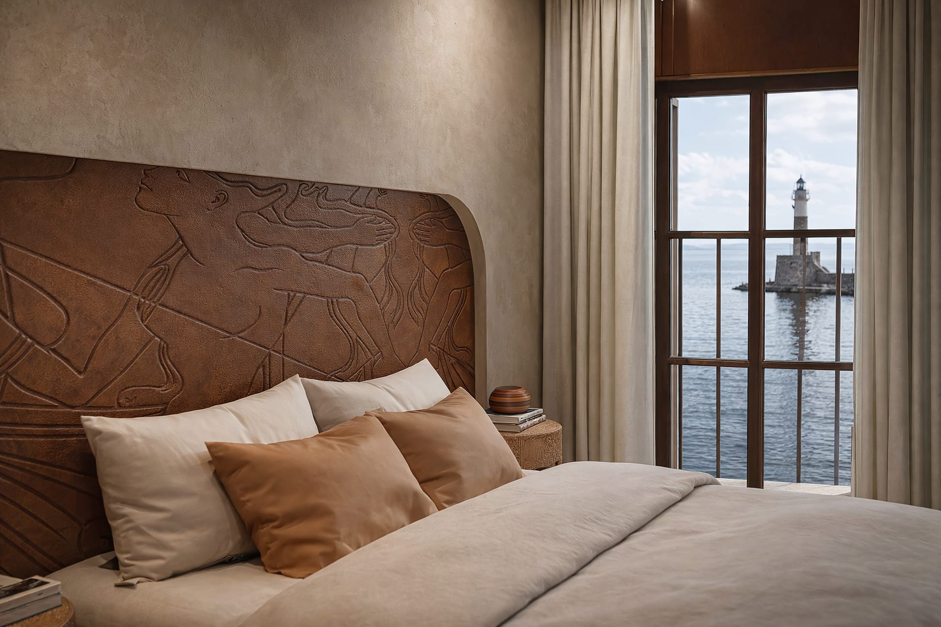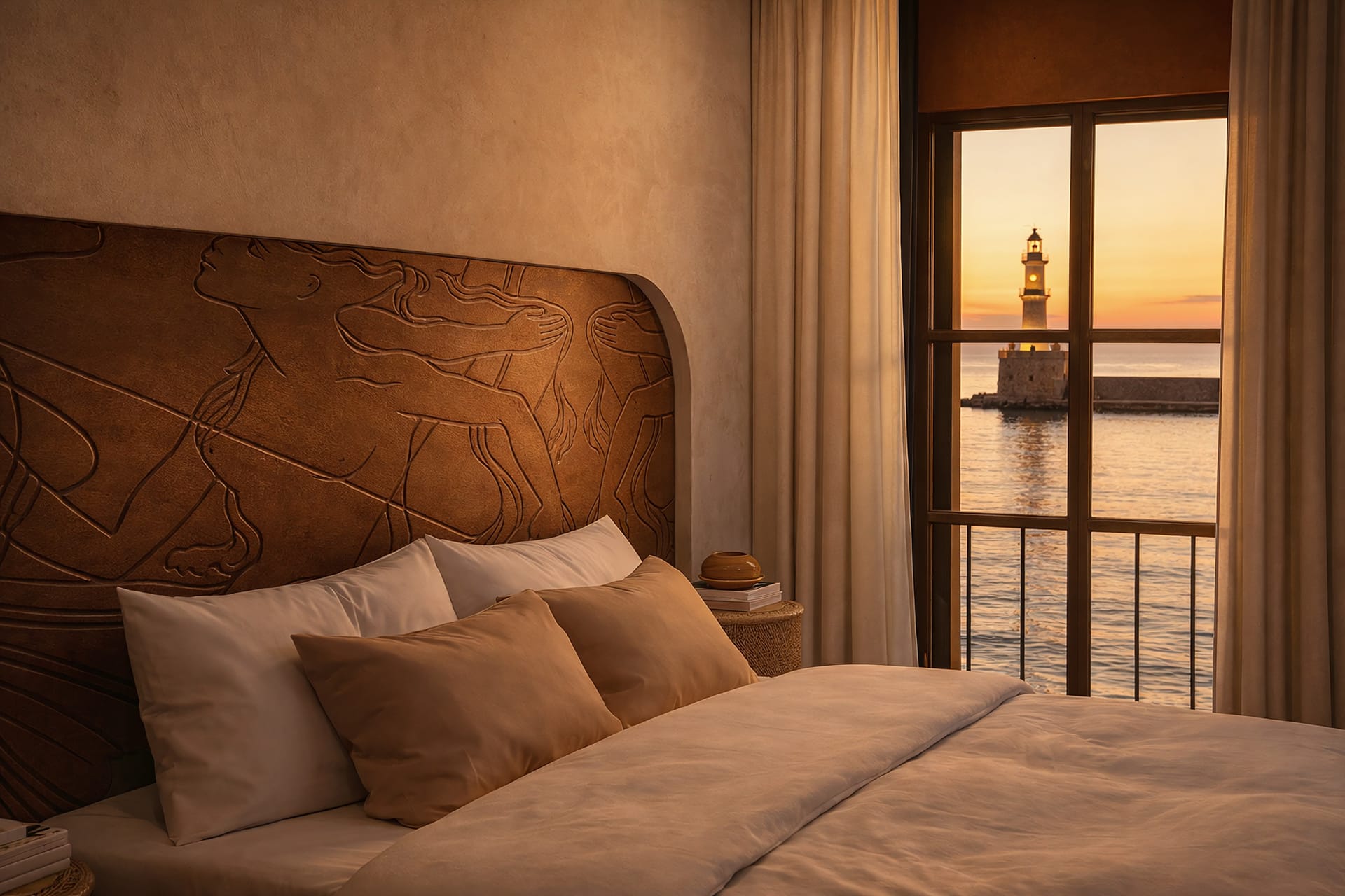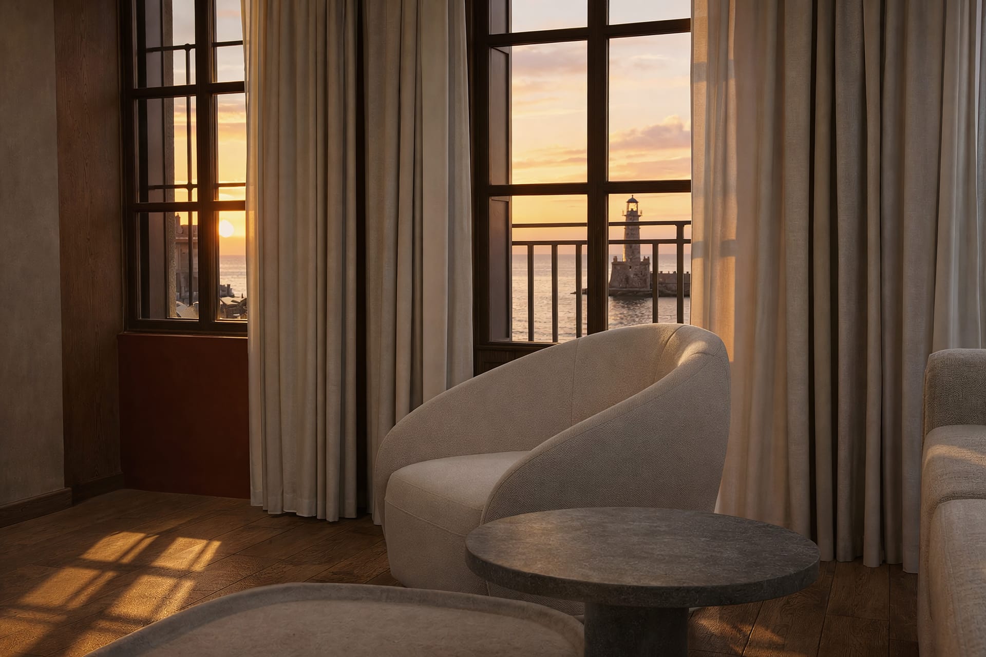 This room is located in the annex of The Chania Hotel Vignette Collection, offering stunning views of the old harbor of Chania, the old Venetian lighthouse, and the Aegean Sea.